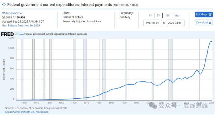 笔者2019年就写了系列文章研究美债危机,那时美债虽然已有不好的发展势头,但余额不过21万亿美元、年利息3000亿美元出头,而如今最新数字已是38万亿美元。2025年美债利息预计1.3万亿美元,大幅超过军费开支,指数增长正冲向2万亿美元,直追第一大的社保开支,这意味着什么,稍有脑子的人都知道。美债长期已不可信,美债日常的"借新还旧"操作转向短债迅速滚动,市场认为美债短期风险还不至于爆发,以此维持局面。全球多国已对美债十分警惕,海外持有美债占比从三分之一跌向五分之一。