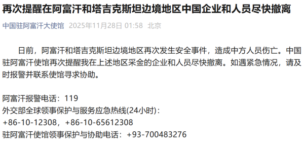 据中国驻阿富汗大使馆微信公众号消息,11月28日,中国驻阿富汗大使馆发布安全提醒: