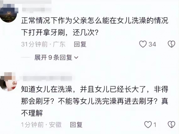 有网友站在女孩这边,觉得不管是不是误会,家人之间也应该讲隐私,孩子大了,作为父亲要有边界感,进浴室、卧室也该敲门,这是最基本的尊重。