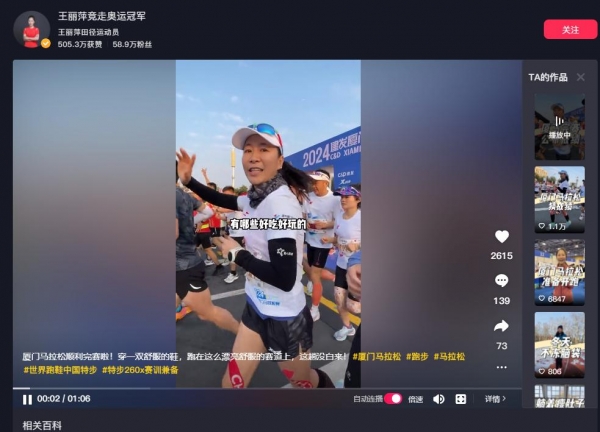近几年,短视频的快速发展,让王丽萍看到了机遇。她也在抖音上创建了名为"王丽萍竞走奥运冠军"的账号。每天分享跑步小知识,通过三年多的运营,她的粉丝已经拥有了58.9万,大部分粉丝都是精准的跑友,有了奥运冠军的分享,这些跑友们对于跑步这件事表现得更加积极。