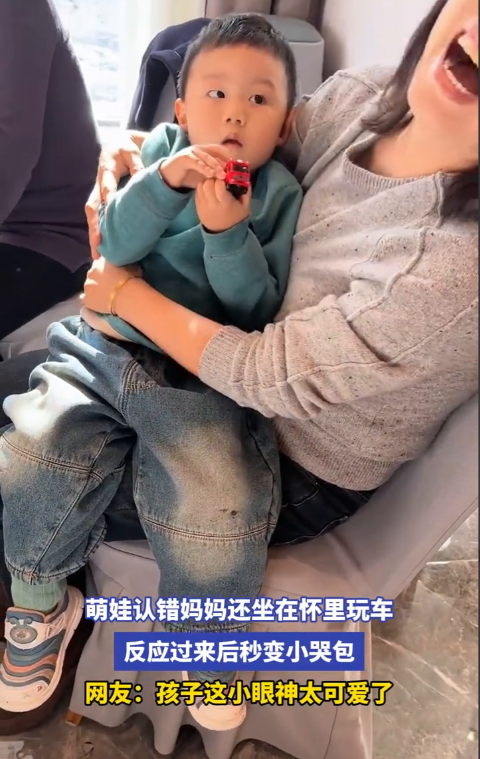 视频中,一小男孩认错妈妈,窝在别人怀里淡定玩玩具,看到自己妈妈站在眼前才惊觉自己认错妈妈了,反应过来后秒变小哭包。