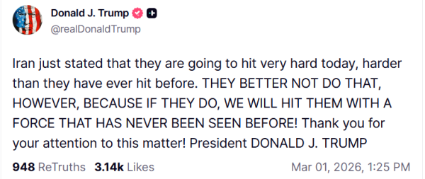 当地时间3月1日凌晨,特朗普在社交媒体发文:伊朗刚刚宣称他们今天要发动非常猛烈的打击,比以往任何时候都要猛烈。他们最好别这么做。如果伊朗这么做,我们将以史无前例的武力打击他们。