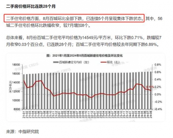 中指院数据显示,今年8月,其监测的全国100个城市二手住宅价格环比全部下跌,已连续5个月呈现集体下跌状态。