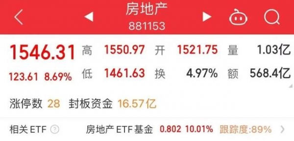 A股房地产板块集体大涨,万科、华侨城、信达地产、金地集团、绿地控股、上海临港等近20股开盘涨停或接近涨停。
