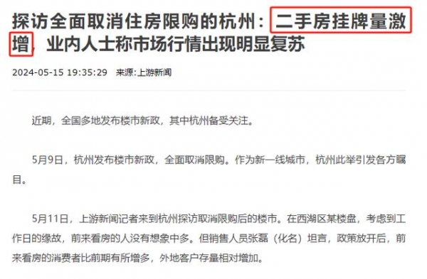 今年5月9日,杭州全面取消限购。新政出台当天,二手房挂牌量激增。据杭州贝壳研究院的数据,对比4月单日均值,新政首日二手房咨询量增加54%,二手房新增买卖房源增长91%。