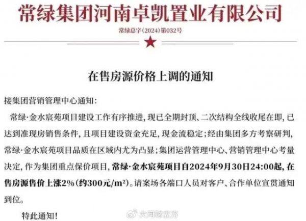 9月28日,河南本土房企河南卓凯置业有限公司发文称,自9月30日24时起,对旗下常绿·金水宸苑项目在售房源售价上调2%(约300元/平方米)。