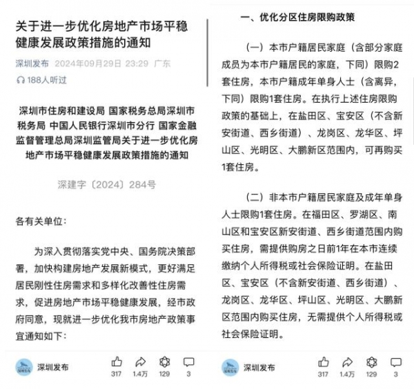 广州官宣后,深圳也发布"关于进一步优化房地产市场平稳健康发展政策措施的通知",火速出台松绑政策。