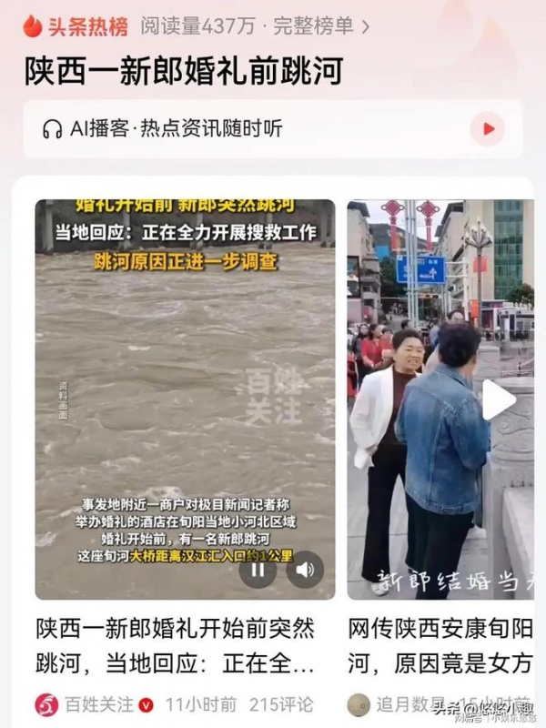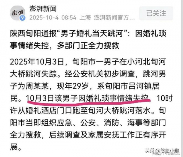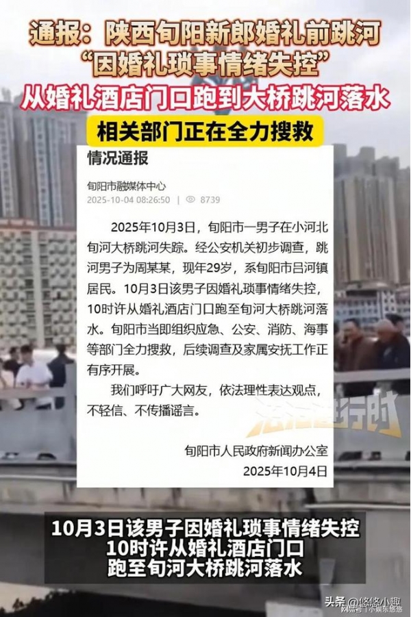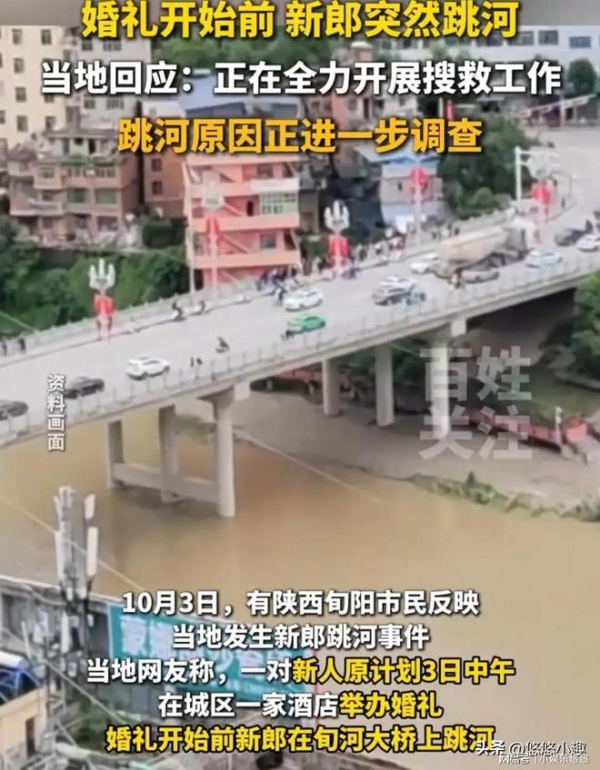 10月3日,陕西旬阳发生了一起非常令人痛心的事情。一位29岁的新郎,在结婚当天从当地的旬河大桥一跃而下,至今还没有任何的消息。