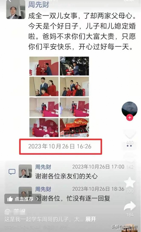 两人在2023年6月份订婚,直到两年后,才终于走上了婚姻的殿堂,在父母眼里,如今儿子事业有成,终于有了自己的家庭。两老也能放心。