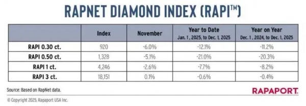 戴比尔斯此次降价,源于全球钻石市场需求下滑后带来的价格下跌。据RapNet 钻石价格指数(RAPI)显示,2025年,3克拉以上钻石RAPI微跌0.4%;0.3-0.5克拉等小颗粒日常消费级钻石,受培育钻石冲击和需求疲软影响,价格跌幅显著,2025年0.5克拉钻石全年跌幅超过20%。