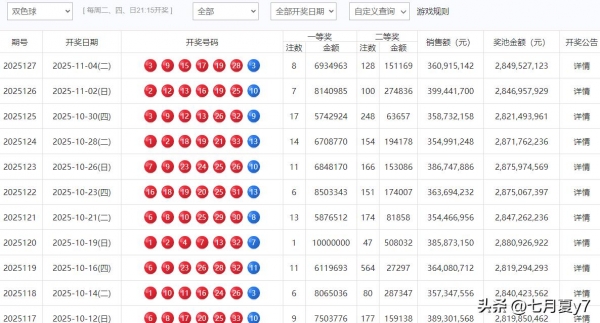 2025年11月4日,中国福利彩票"双色球"第2025127期顺利开奖,本期全国销售金额达360,915,142元,市场参与度保持稳健。