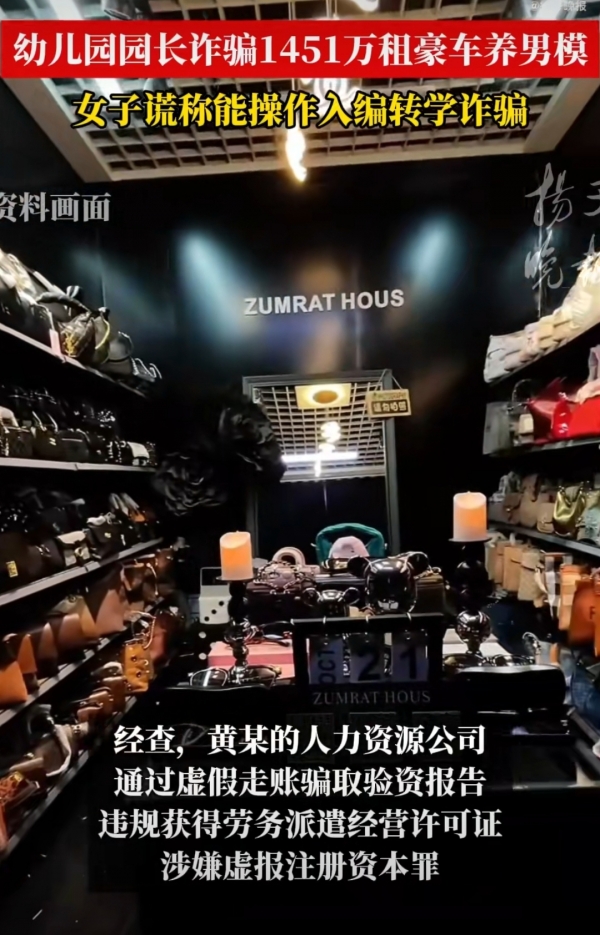 江苏镇江,"90后"的幼儿园园长黄某在经营幼儿园之后,生活变得骄奢淫逸,痴迷奢侈品,一度负债200万元左右,为了偿还债务,她伙同另外两人,另外两人扮演某主任的角色。开起了一家人力资源公司,声称能帮办理入学、入编和保公职等事项。