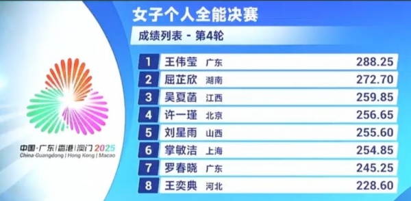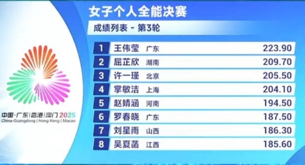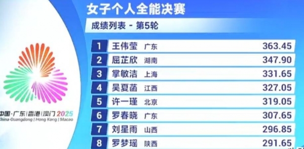 第四轮稍有波动,王伟莹跳出64.35分,不过依旧稳居第一。战况开始混乱,名次变化频频:屈芷欣、吴夏涵、许一瑾轮番登顶、下滑,掌敏洁也短暂跌出前五。五轮结束后,终于尘埃稍定:王伟莹领先优势巨大,363.45分占据榜首,屈芷欣347.90分第二,而掌敏洁凭借最后那一跳逆袭上第三,真是漂亮的"压哨逆转"!