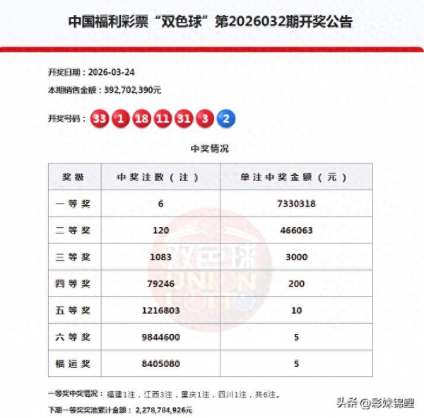 3月24日,双色球26032期开奖,以下是本期的开奖公告: