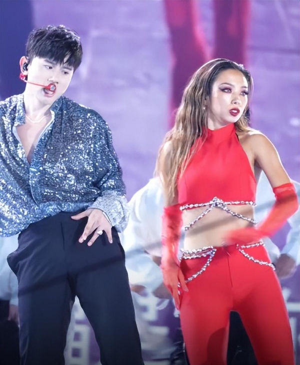 再来看这第二个动作,俩人靠得那是一个近啊,只见张杰是双手伸开一脸用力的唱着歌,而那位美女则是双手放在腰间,尽情地热辣舞动起来。