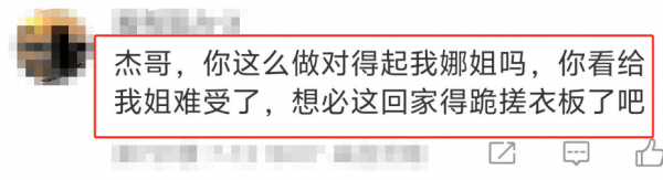 甚至有网友在评论区讲道:杰哥,你这么玩对得起娜姐嘛,你看给我姐难受的,都发微博了,这回家不得跪搓衣板赔罪了,不然都不能轻易原谅你。