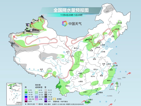 预计4日至6日新疆西部和北部将先后出现大范围雨雪天气,天山沿线以及阿勒泰周边地区多大到暴雪。