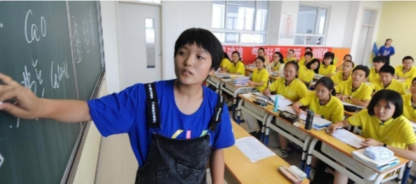 讲台上,正在黑板上一笔一划写字"小老师"就是王心怡,可能她的同龄人现在还在为课后作业亦或是去哪里玩耍而发愁,而我们的学霸王心怡怀揣着心中的梦想已经在村里的学校教导她的弟弟妹妹们学习。