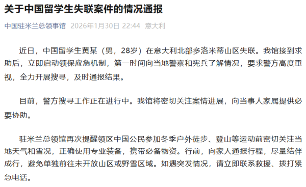 据中国驻米兰总领事馆微信公众号消息,1月30日,中国驻米兰总领事馆发布关于中国留学生失联案件的情况通报: