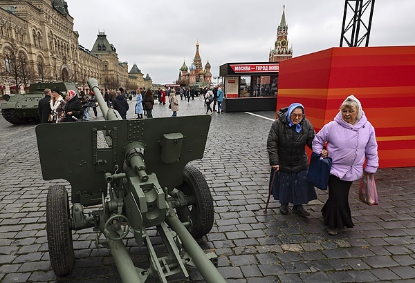 当地时间2025年11月7日,俄罗斯莫斯科,游客走过一件苏联时期的火炮,当日红场举行展览,纪念1941年二战"莫斯科保卫战"84周年历史性阅兵。