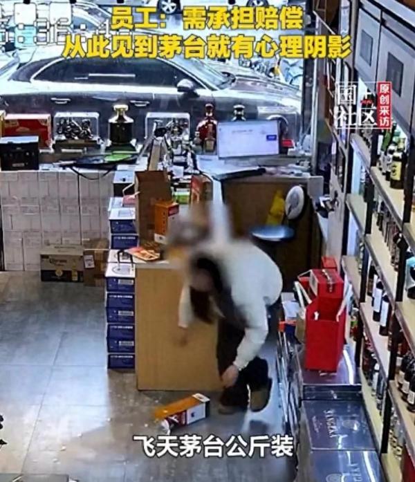3月1日,浙江义乌。员工在装袋时手一抖,3000多元飞天茅台公斤装被当场摔碎。