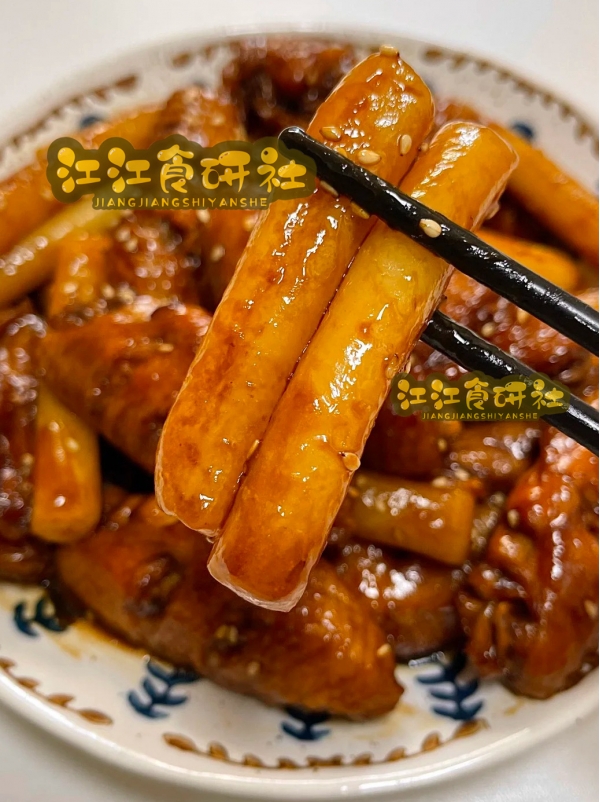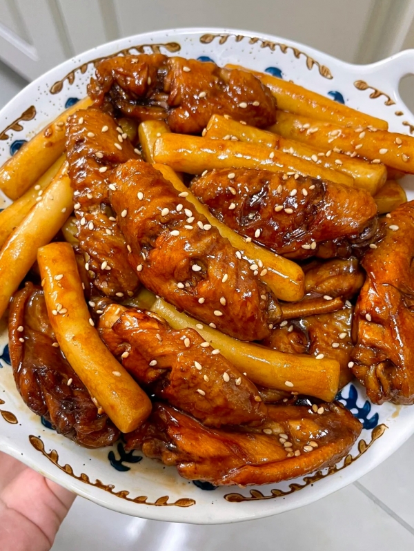 鸡翅油亮红润,年糕吸饱了汤汁,软糯香甜。