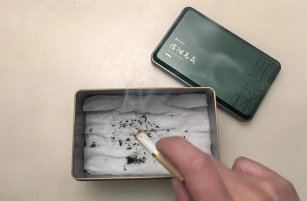 我扭头看见了几个空茶叶盒,就拿来往茶叶盒底部放一张纸巾,用水打湿。抽烟时,烟灰弹进去、烟头一丢,湿纸巾还能直接熄灭烟头,吸收烟味。吃完饭后,把纸巾倒掉,水一冲就干净,下次还可以再重复用。
