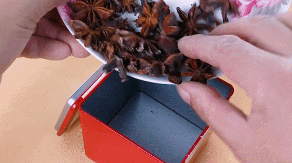 我们可以把大料装进去,盖好盖子,一个放八角,一个放花椒,一个放桂皮。茶叶盒的密封性特别强,能防潮,防止香料散走气味。在盒子外面贴个小标签,写上名字,用的时候一下就能找到。