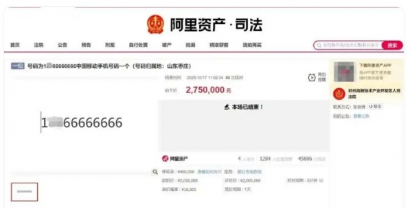据潇湘晨报,标的物介绍显示,此次拍卖系司法拍卖,处置法院是郑州高新技术产业开发区人民法院。"1**66666666"手机号归属地为山东枣庄,运营商是中国移动,拍品所有人系被执行人张某。目前套餐费用为159元,截至2025年9月15日,话费余额为负11.74元。该号码起拍价为200万元,保证金40万元,增价幅度1万元。此次拍卖吸引了4.6万人次围观,4人报名,经过67次出价,最终以275万元成交。