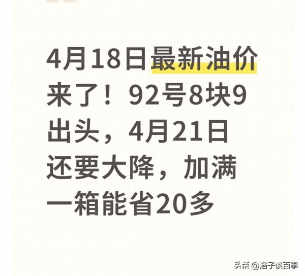 4月18日全国油价已经更新,92号汽油均价8.91元/升,95号9.55元/升,0号柴油8.62元/升。更让人开心的是,4月21日24时油价要大幅下调,每升能省4毛多,加满一箱油能省下一顿饭钱,这对咱们普通人来说,是实打实的民生利好。