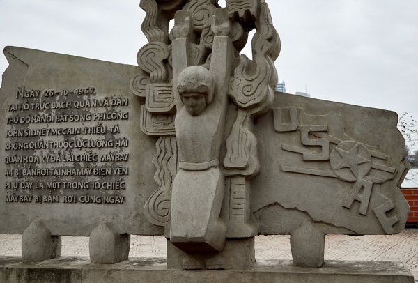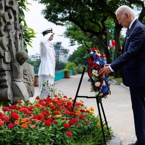 ▲2023年美国总统拜登在越南麦凯恩纪念碑前献花圈,注意看纪念碑上那名飞行员麦凯恩的跪地投降姿势。