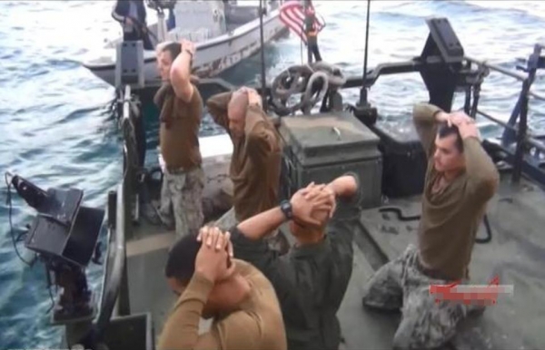 ▲美军投降的姿势是非常标准统一的,图为2016年美军巡逻艇闯入伊朗海域被伊朗俘虏时,当伊朗军舰驶来时,发现美军已经集体跪地等待投降