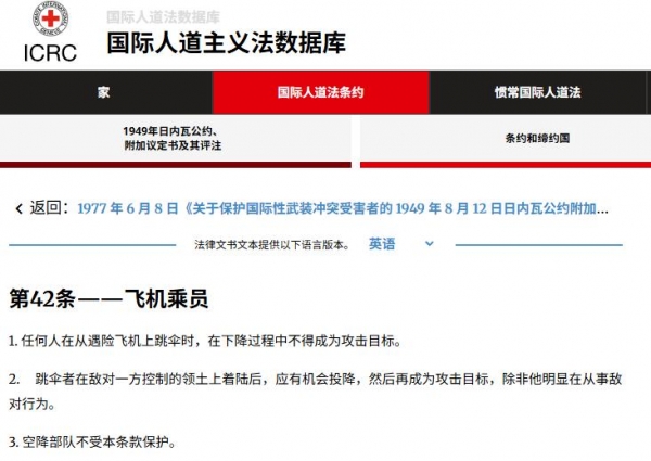 根据《日内瓦公约》规定,飞行员被击落跳伞后的下降过程中,不得被攻击。落入敌占区后,应给予投降机会,除非飞行员做出敌对行为,才可以作为攻击目标。