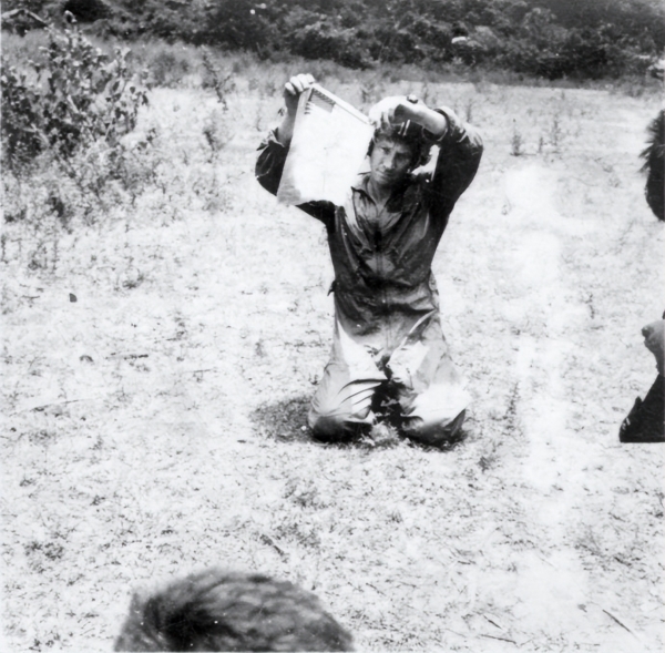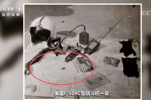 ▲1965年我军击落一架美军飞机,被俘飞行员摆出投降姿势,并缴获一张血幅