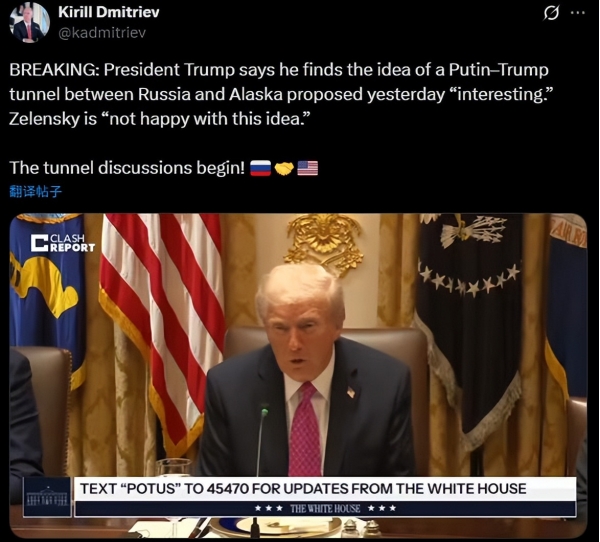 第二个坏消息,俄罗斯特使德米特里耶夫突然抛出"普京-特朗普隧道"计划,特朗普被问及时没拒绝,反而笑着说"这想法挺有趣"。