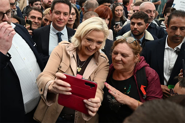 当地时间10月8日,法国极右翼政党国民联盟领导人玛丽娜·勒庞与支持者自拍。 视觉中国