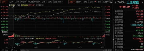 交易行情显示,1月12日,A股三大股指开盘涨跌不一,开盘后集体震荡走高。截至收盘,上证综指、深证成指、创业板指分别收涨1.09%、1.75%、1.82%,分别报4165.29点、14366.91点、3388.34点。