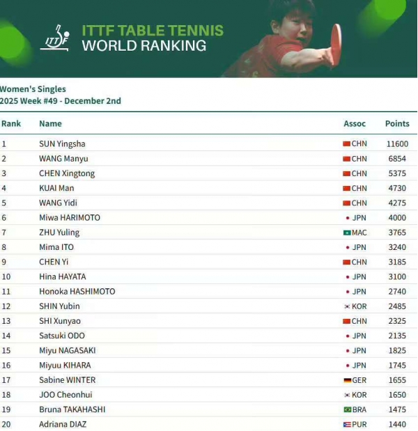 北京时间2025年12月2日消息,今天上午,WTT国际乒联公布了最新一期的世界排名情况。在10月5日的中国大满贯结束后,事实上国乒主力就进入到了赛事调整阶段,此后只是参加了印度的亚锦赛。这之后的伦敦站、蒙彼利埃站、法兰克福站,国乒都没有主力参加单打。11月中旬又是全运会,包括目前正在进行的赛事,还是成都混合团体世界杯。所以总结下来,将近2个月的时间,国乒主将没有亮相世界顶级单打赛事中,在单打排名上没有什么变化。--本月中旬,12月10日开打的WTT年终总决赛,莎莎、大头等主将预计将会亮相单打比赛中,所以届时的排名也将出现新的变化。