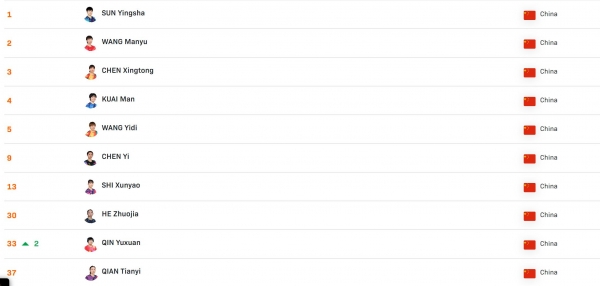在前20名这个范围内,莎莎领衔国乒占据7席,张本美和领衔的日本队同样占据7席,这可以看出日本女单将继续在洛杉矶奥运周期,成为国乒的主要威胁。此外,中国澳门1席,韩国队2席,德国、巴西、波多黎各各1席。