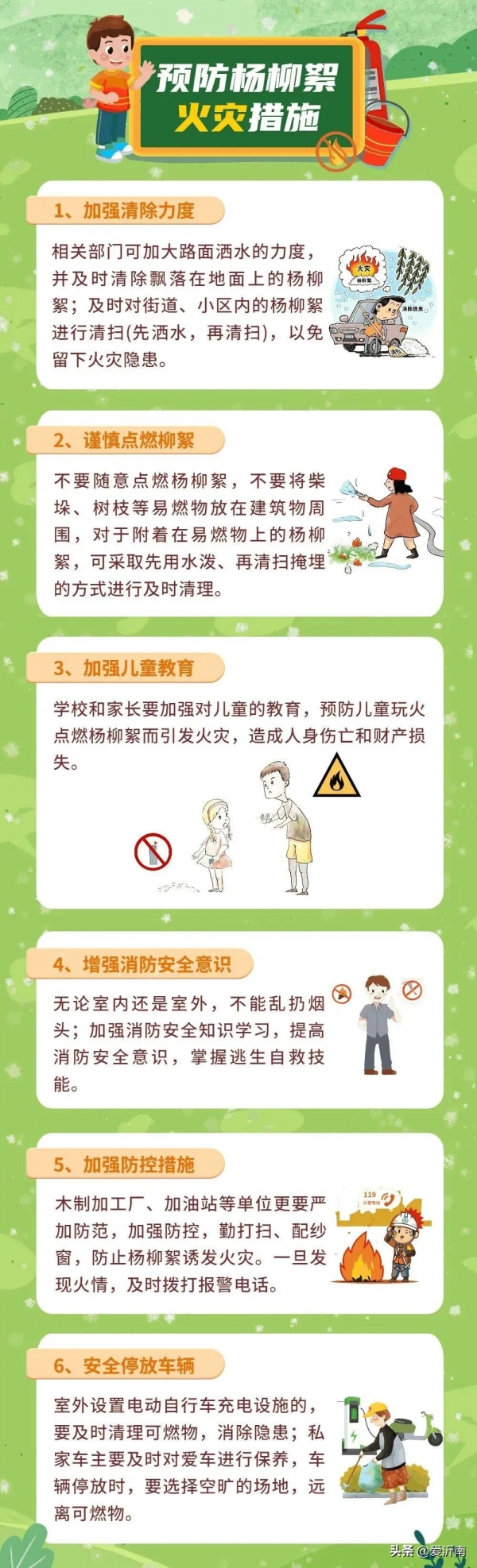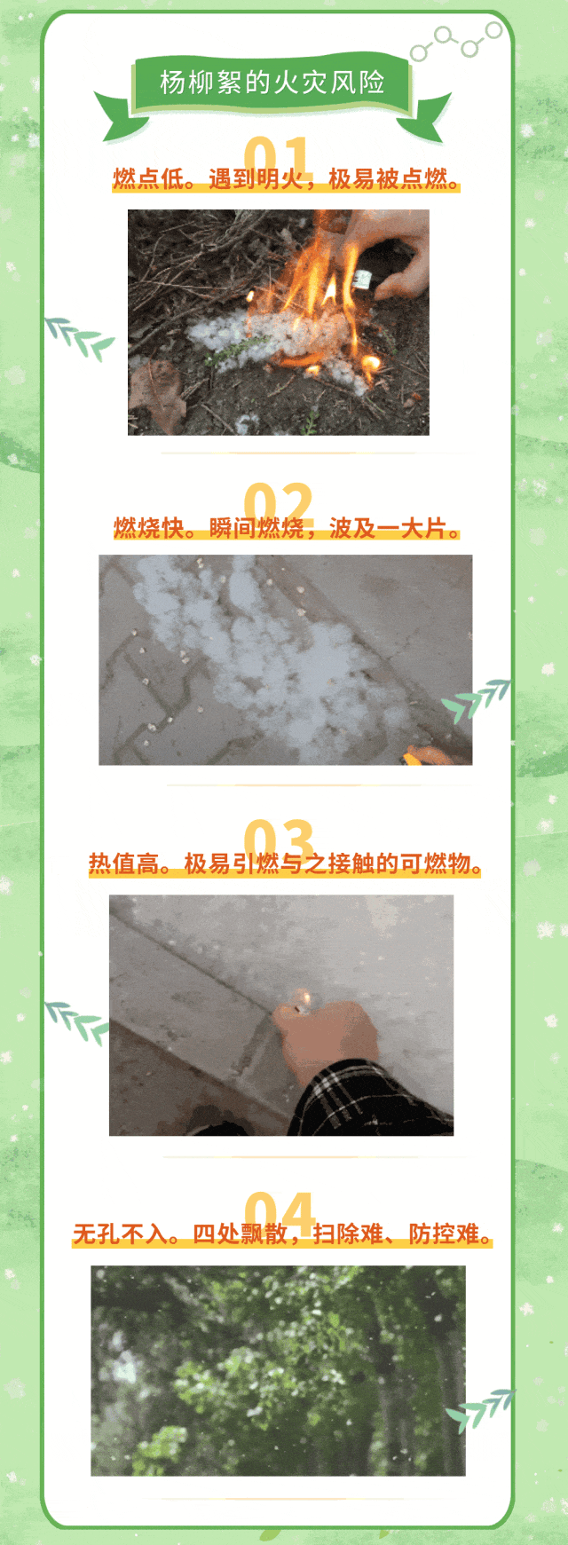 杨柳絮属于易燃物质,遇到明火可在2秒内迅速燃烧,再加上其本身十分轻盈,随风飘荡,极易引发火灾,加上一些人防火意识薄弱,乱扔烟头现象严重,极易成为火灾的导火索。