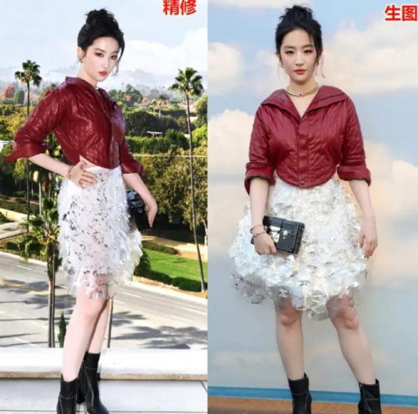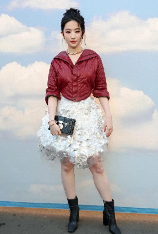 这套造型其实暗藏玄机--枣红色皮衣是为了致敬《花木兰》的飒爽英气。但设计师显然忽略了刘亦菲的"圆身形"特质:绞花纹理视觉膨胀,短款设计放大腰臀曲线,与国内活动那些流畅遮肉的高定裙相比,简直是"自曝其短"。有粉丝翻出她抵达好莱坞时的路透图:同一件皮衣外搭黑色大衣,立马气场全开。可见不是人不行,是搭配出了问题。