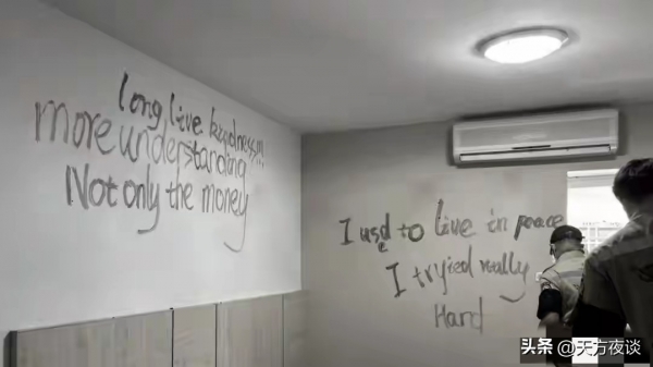 而在房间的墙壁上,还留着几行用英文写的遗言,字迹看着是用鲜血写成,内容满是绝望,大概是"我曾过着平静的生活,我真的尽力了""理解比金钱更重要",这些血书,也成了了解整件事的关键线索。