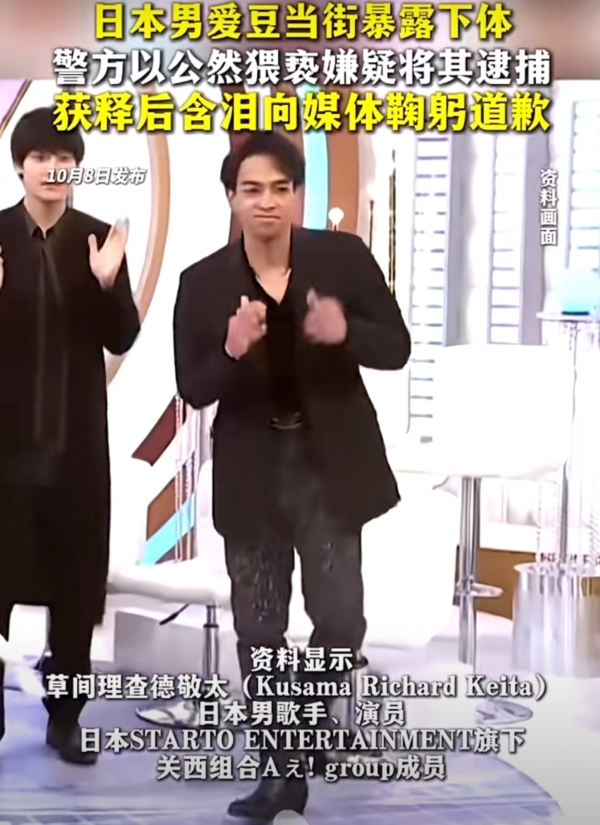 29岁的日本男爱豆草间敬太,凌晨5点半在东京新宿一栋大楼门口公然暴露下体,被路人报警后当场逮捕。