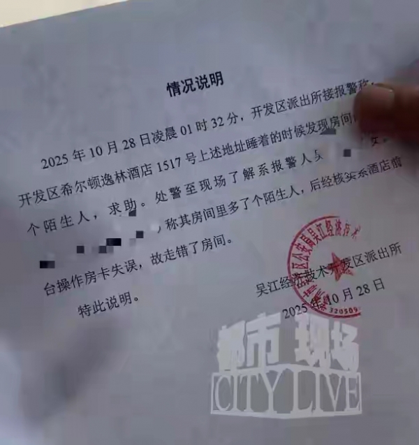 后来派出所出的情况说明写得清楚,凌晨1点32分接的警,查完才知道是酒店前台房卡操作失误,让隔壁住客走错了房间。