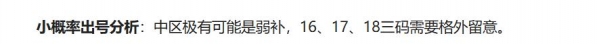 小概率出号分析:两个重码要格外留意。中区在16、19、21三码中应该会有一码。