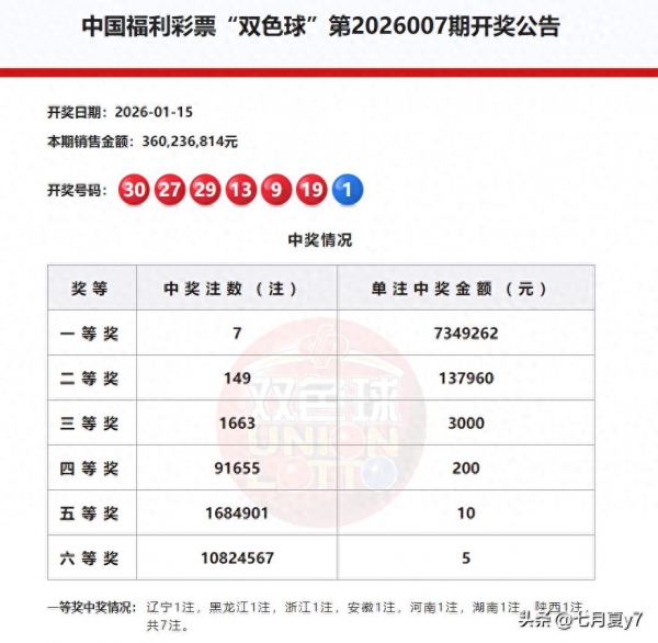 中国福利彩票双色球第2026007期于1月15日晚揭晓,全国销量3.6024亿元,奖池继续高位运行。开奖号码:红球09、13、19、27、29、30,蓝球01。下面用数据说话,带您速览本期五大看点。