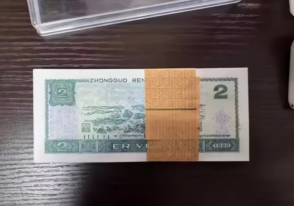 拍卖的是第四套人民币里的两元面值,分成1980年和1990年两个版本。1980版有50捆,5000张,全是密封的,没拆过。1990版55捆,5500张里有3捆被标了"绿幽灵"。