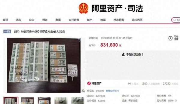 浙江永嘉县法院拍卖一批扣押的旧版人民币,一共10500张2块钱的纸币,最后居然卖了83.16万。起拍才20.76万,一下子翻了快四倍。拍的人还不少,44个人报名,竞价过程持续24小时,最后在1月5号上午11点多结束。