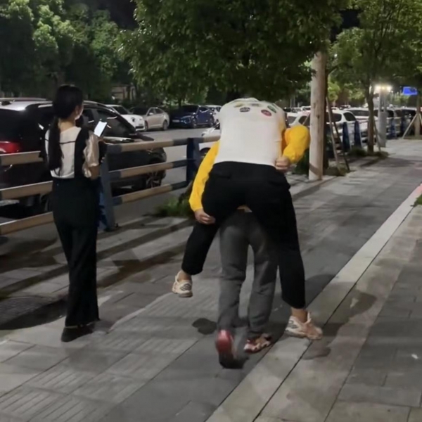 跑腿小哥来到之后,背起男子,一行三人走在马路上。