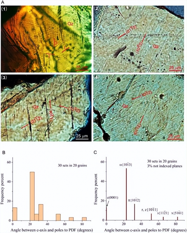 证据来自该区域岩石的微观结构,科学家在其中发现了一种特殊的微观结构--"石英击变面状页理"(Planar Deformation Features, 简称PDFs)。